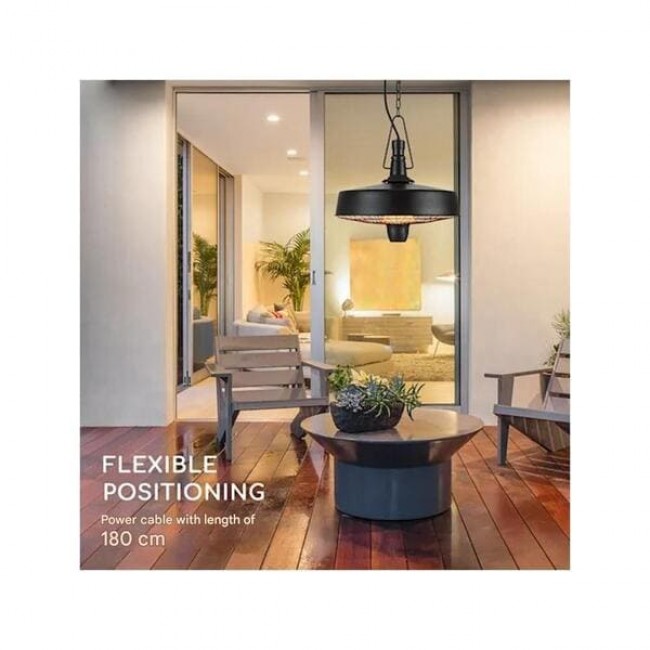 У комплект поставки входить посилений сталевий ланцюг, за допомогою якого можна прикріпити обігрівач Blumfeldt Camden Heat до стелі або будь-якої горизонтальної перекладини, підвісивши його, наприклад, над обіднім столом Вашої тераси або літнього майданчика. Blumfeldt Camden Heat працює безшумно і вже за хвилину нагрівається до робочої температури, створюючи м'яке та комфортне тепло подібне до сонячного. Важливою особливістю інфрачервоного хвильового випромінювання є те, що воно має спрямований характер і, на відміну конвекційного обігріву, нагріває не повітря, а предмети і людей, що знаходяться в радіусі дії. При цьому протяги або холодне повітря не здувають інфрачервоні хвилі та не впливають на інтенсивність обігріву. Тому в усьому світі інфрачервоні обігрівачі переважно застосовуються саме в умовах вулиці. Інноваційні карбонові нагрівальні елементи, якими оснащені обігрівачі Blumfeldt Camden Heat, генерують гик-хвилі середнього діапазону, і на відміну від галогенових обігрівачів, створюють приємніше тепло, що проникає, що нагадує тепло від каміна.