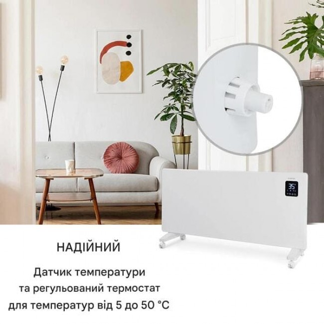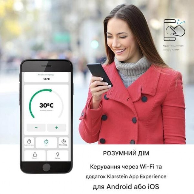 Щоб ви завжди мали повний контроль, Bansin Smart 2500 є частиною програми Klarstein App Experience : легко керуйте одним або кількома обігрівачами за допомогою свого смартфона. Це дає вам гарантію, що у вашій ванній кімнаті завжди буде комфортно тепло, коли ви прийдете додому, або що вона не буде нагріватися без потреби, якщо ви забудете вимкнути конвектор . Звичайно, керування також можливе за допомогою сенсорної панелі керування та світлодіодного дисплея на передній панелі пристрою.