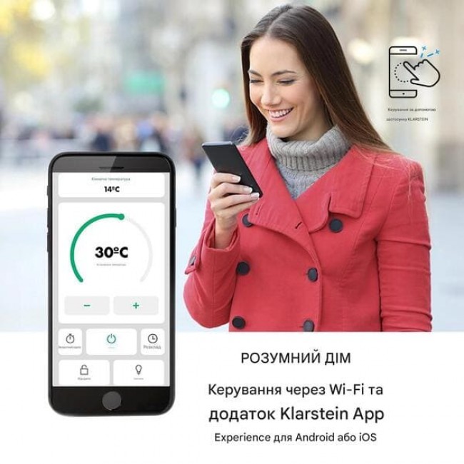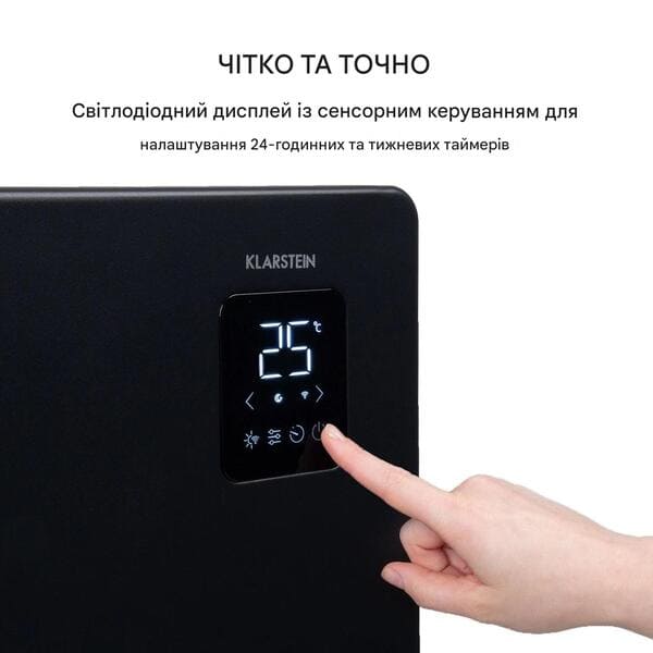 Щоб ви завжди мали повний контроль, Bansin Smart 2500 є частиною програми Klarstein App Experience : легко керуйте одним або кількома обігрівачами за допомогою свого смартфона. Це дає вам гарантію, що у вашій ванній кімнаті завжди буде комфортно тепло, коли ви прийдете додому, або що вона не буде нагріватися без потреби, якщо ви забудете вимкнути конвектор . Звичайно, керування також можливе за допомогою сенсорної панелі керування та світлодіодного дисплея на передній панелі пристрою.