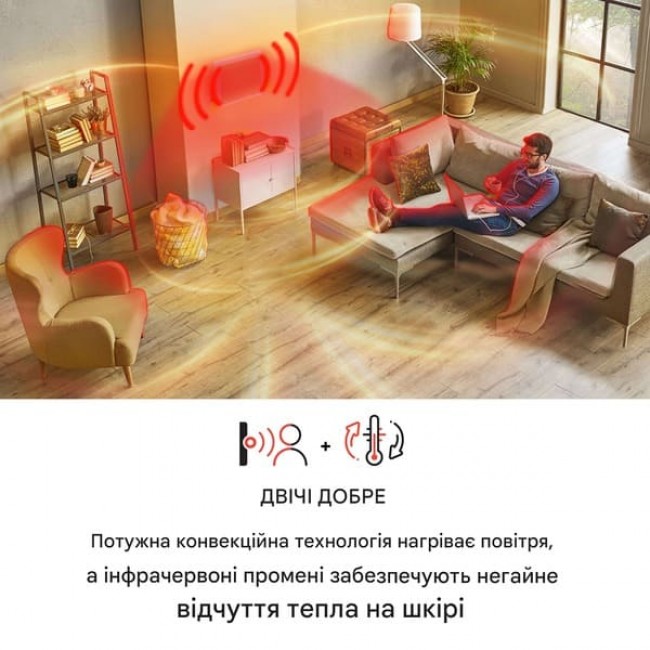 Вдвічі краще: потужна конвекційна технологія нагріває повітря, а інфрачервоні промені забезпечують миттєве відчуття тепла на шкірі