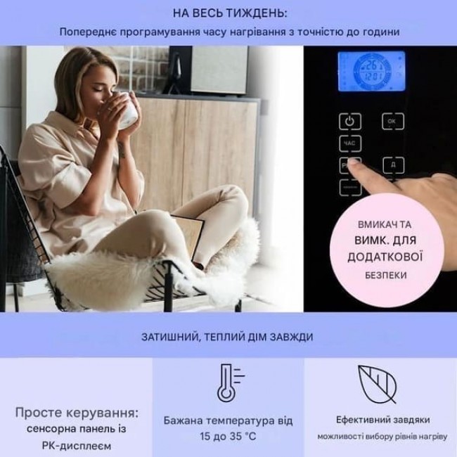 Всі налаштування здійснюються безпосередньо на сенсорній панелі пристрою. Вбудований РК-дисплей надає чітку інформацію про вибрані функції та показує температуру в приміщенні. Елегантна біла передня панель зі скла товщиною 5 мм надає будь-якому приміщенню додаткову нотку розкоші.