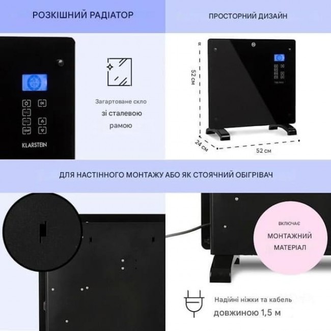 - Розміри (обігрівач без скляної панелі): приблизно 46 x 44 x 7 см (ШxВxГ)