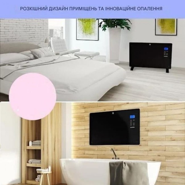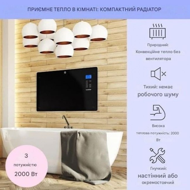 Всі налаштування здійснюються безпосередньо на сенсорній панелі пристрою. РК-дисплей, який також вбудований, надає чітку інформацію про вибрані функції та показує температуру в приміщенні. Елегантна чорна передня панель зі скла товщиною 5 мм надає кожній кімнаті додатковий відтінок розкоші.