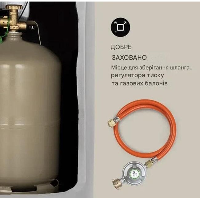 - Добре захованіМісце для зберігання шланга, редуктора тиску і газових балонів