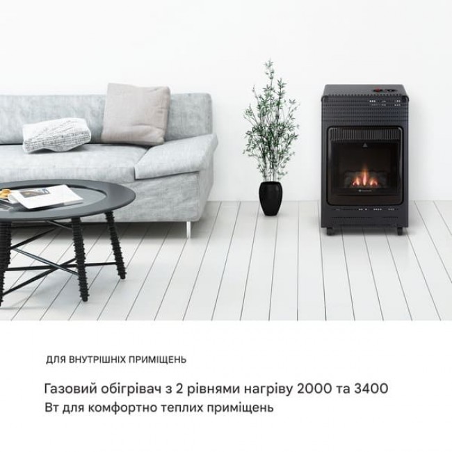 Для приміщень: газовий нагрівач із двома рівнями нагрівання потужністю 2000 і 3400 Вт для комфортного теплого приміщення.