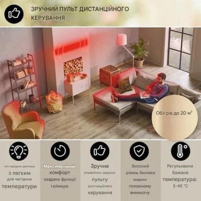 - Простий і зручний: легке керування за допомогою дистанційного керування з поступовим регулюванням температури навколишнього середовища