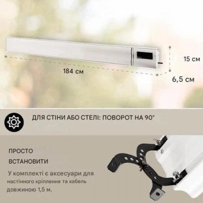 - Наддовгий нагрівальний елемент: прожектор шириною 165 см для ефективного обігріву столів