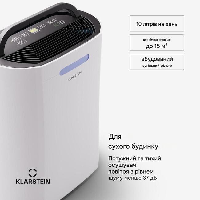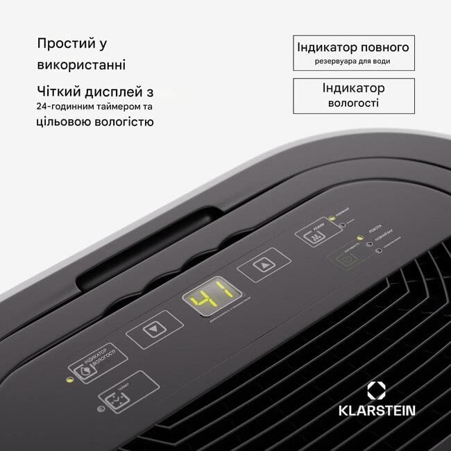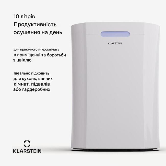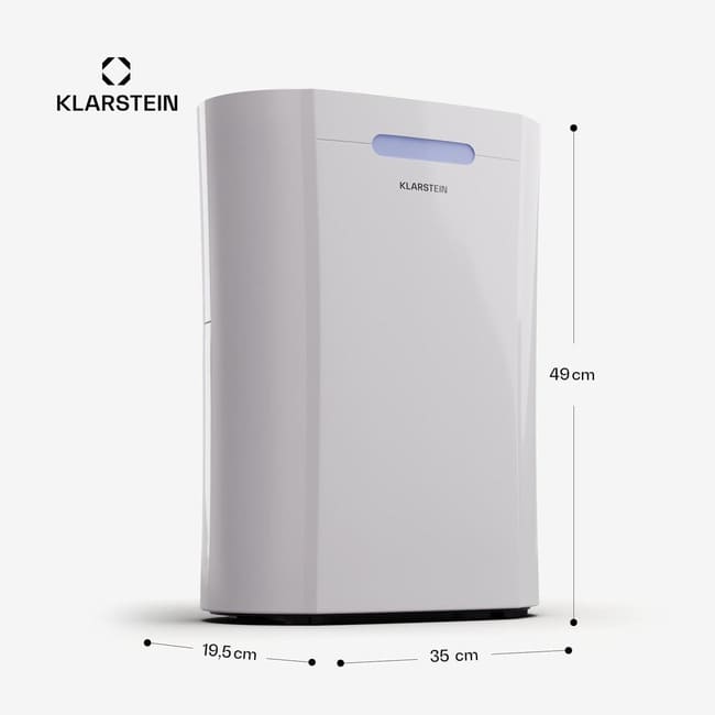 Чисте повітря з потрібною вологістю: осушувач Klarstein AeroDry 10 не тільки осушує вологі приміщення після будівництва, ремонту та пошкодження водою. Він також легко регулює вологість повітря на кухні, у ванній кімнаті та спальні та надійно видаляє з повітря пил, бактерії та неприємні запахи завдяки вбудованому фільтру з активованого вугілля! Завдяки потужній потужності 165 Вт і циркуляції повітря 265 м³ на годину потужний осушувач усуває до 10 літрів вологи з повітря на день, що робить осушувач Klarstein AeroDry 10 чудовим для приміщень площею до 25 м². Великий 2,5-літровий резервуар збирає отриману воду, і його можна легко спорожнити. Управління також є практичним: AeroDry 10 програмується для виконання завдання за допомогою лише кількох кнопок на верхньому дисплеї. Цільову вологість можна встановити від 40 до 80% відносно з кроком 5 відсотків. Вологість можна регулювати. Також доступні 24-годинний таймер і вибір між розумним режимом і режимом очищення повітря.