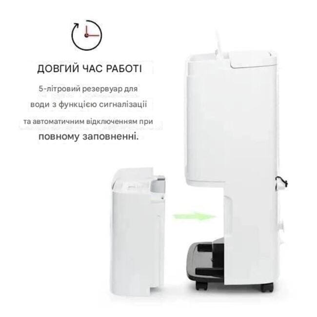 - Автоматичне осушення: пристрій починає працювати, коли вологість на 5% перевищує встановлене значення