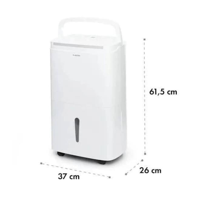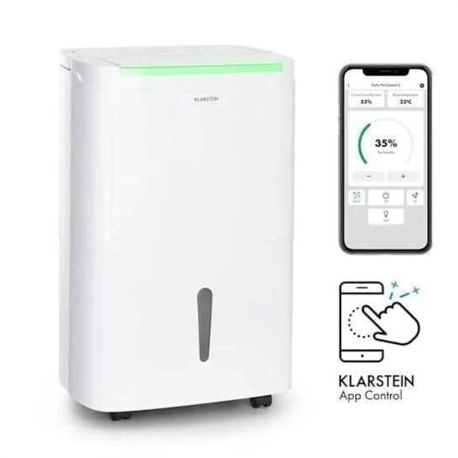Відчуйте себе набагато комфортніше з правильною вологістю: осушувач Klarstein DryFy Connect 50 миттєво усуває вологе повітря й дає змогу вільно дихати на кухні, у ванній або спальні, а також дає змогу швидко висохнути після будівельних або ремонтних робіт. У разі циркуляції повітря 360 м3 на годину він видаляє з повітря до 50 літрів вологи на день, що робить осушувач повітря Klarstein DryFy Connect 50 ідеальним для приміщень площею від 45 до 55 м2. Великий 7-літровий бак збирає воду та завжди може бути своєчасно спорожнений завдяки функції будильника й автоматичному вимкненню у разі заповнення бака. Набрана вода просто відкачується натисканням відповідної кнопки за допомогою зливного шланга. Завдяки інтерфейсу Wi-Fi пристрій також можна зареєструвати в домашній мережі та легко керувати ним через застосунок Klarstein. Це ще не все, Klarstein DryFy Connect 50 стає очисником повітря завдяки вбудованому фільтру з активованим вугіллям, який, крім пилу та запахів, також відфільтровує з повітря дрібний пил і мікроби, у такий спосіб удвічі покращуючи клімат у приміщенні в одному пристрої.. Високий рівень зручності використання також практичний: DryFy Connect 50 програмується для виконання свого завдання за допомогою декількох кнопок на верхньому дисплеї. Цільову вологість можна встановити так само, як програмований погодинний таймер.