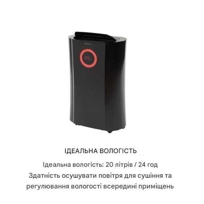 - Ідеальна вологість: потужність осушення 20 літрів за 24 години для регулювання вологості в технічній кімнаті, а також на кухні, у ванній або спальні