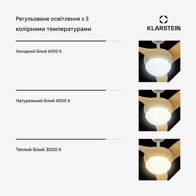 Вентилятор оснащений патроном E27 та пропонує регульоване освітлення з трьома варіантами вибору тонів – холодним, природним та теплим – для створення вашої улюбленої атмосфери.