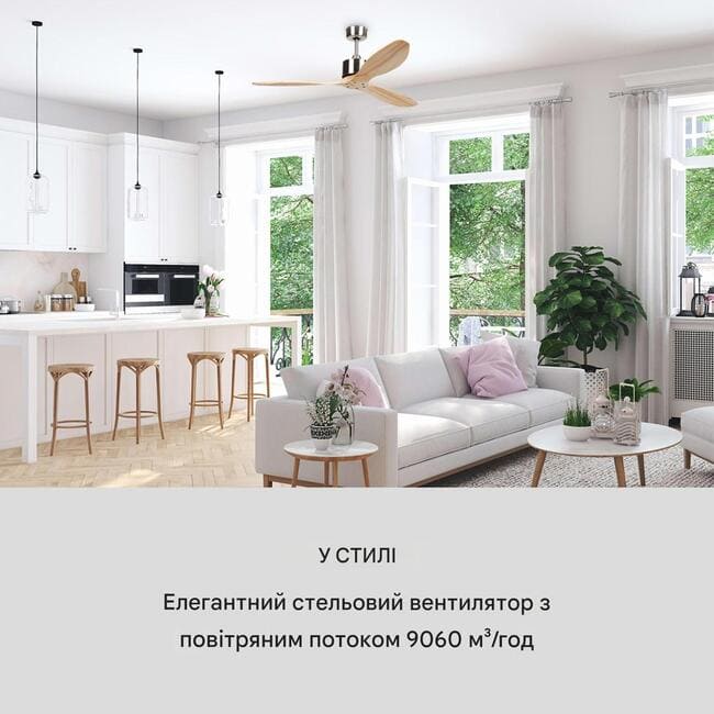 Стельовий вентилятор Klarstein Santa Elena діаметром 132 см (52 дюйми) із 3 рівнями швидкості (висока, середня, низька) надійно переміщає повітряні маси одним натисканням кнопки. Витрата повітря до 9060 м ³ на годину. Його три міцні леза з натурального дерева не тільки виглядають особливо елегантно, але й працюють дуже плавно, з максимальним рівнем робочого шуму лише 45 дБ. Чотириступінчастий таймер (таймер вимкнення), який можна встановити до 8 годин, забезпечує просту роботу. Всім функціям Santa Elena також можна зручно керувати завдяки пульту дистанційного керування, що додається. Витрата повітря: 9060 м³/год