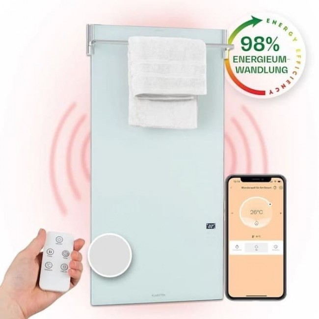 Інновація для гарного настрою: інфрачервоний обігрівач Klarstein Hot Spot Crystal Spotless Smart приносить приємне здорове тепло у ванну кімнату та зберігає затишні теплі рушники для вас. Елегантна нагрівальна панель надзвичайно плоска, її можна повісити прямо на стіну. Ви також можете розкласти вбудовану вішалку для рушників, щоб ваші банні рушники завжди були гарними, теплими та затишними. З потужністю 750 Вт, завдяки інфрачервоному обігріву ComfortHeat, він використовує принцип сонячного тепла та безпосередньо нагріває предмети та людей інфрачервоними променями. Повні 95% споживаної енергії перетворюються на теплові промені енергозберігаючим способом.