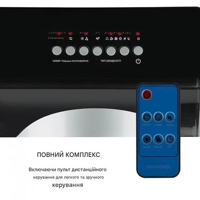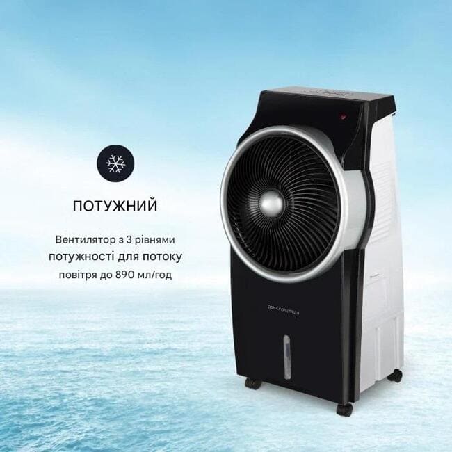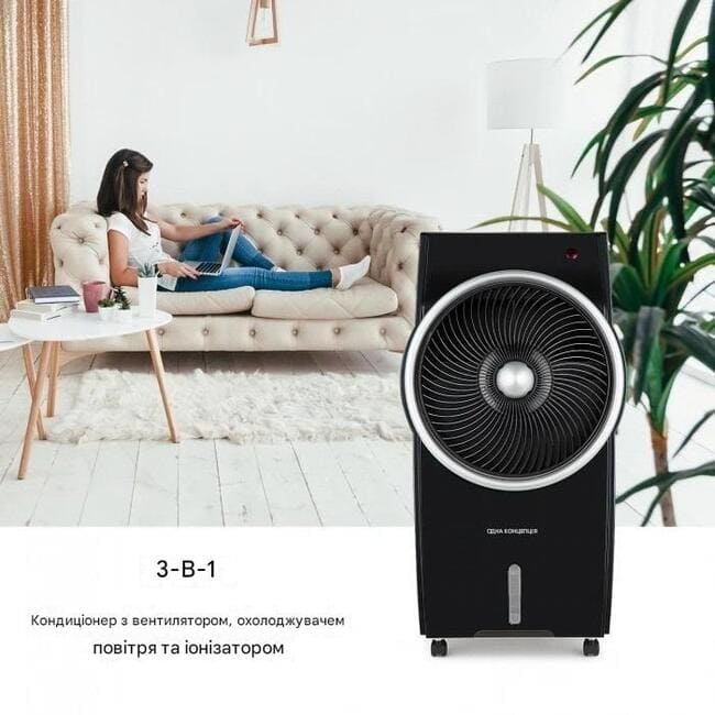 Перемикний охолоджувач повітря спрощує охолодження за столом або на дивані . Зі свого 8-літрового резервуара для води він випаровує прохолодну воду в повітряний потік упродовж декількох годин. Тепло відводиться від нього і в такий спосіб охолоджується екологічно