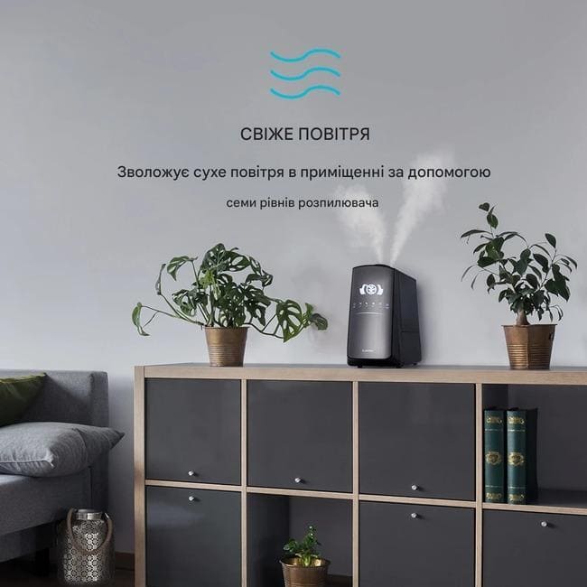 - Свіже повітря: зволожує сухе повітря приміщення за допомогою семи рівнів розпилювача.