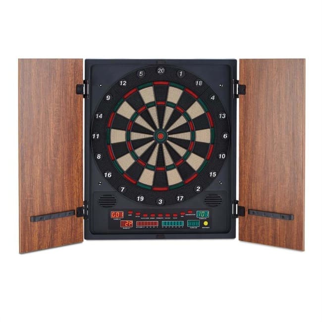 Складаний набір дротиків від Klarfit включає дошку з електронним світлодіодним дисплеєм, а також дванадцять дротиків і блок живлення. Стильний дартс можна встановити всього за кілька кроків, і ви можете почати метати дартс. Початківці можуть спокійно тренуватися з Dartmaster 180. Справжні професіонали змагаються один з одним або протистоять комп’ютерним суперникам, яким можна встановити різні рівні складності. Високоякісний світлодіодний дисплей особливо практичний. Очки інших гравців відображаються на кількох дисплеях. Папір, ручка та складні арифметичні вправи тепер у минулому. Комп’ютер дартс піклується про обчислення та запам’ятовування. Ви можете повністю зосередитися на ідеальному кидку. Немає нічого цікавішого, ніж жвавий вечір дартсу з найкращими друзями. Ще краще, якщо вам не доведеться турбуватися про улюблені меблі. М'які дротики, що входять до комплекту, мають м'який, гнучкий наконечник і тому не залишають подряпин. Навіть якщо ви не влучили в ціль.