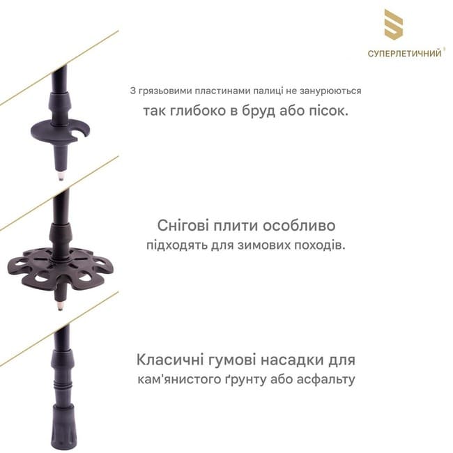 Для прогулянок лісовими та пішохідними стежками палиці оснащені карбідними захисними наконечниками. Щоб ваші трекінгові палиці можна було використовувати на різній місцевості, ми пропонуємо три різні пари наконечників: гумові наконечники для доріг та кам'янистої місцевості, грязьові кошики для ходьби по багнюці або піску та снігові кошики для безтурботних зимових походів.