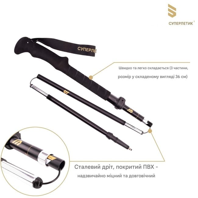 Ці палиці легко та зручно транспортувати завдяки практичній складній конструкції з інтегрованим сталевим дротом з ПВХ-покриттям. У складеному вигляді їх розміри становлять лише 36 x 7 см (Ш x В), тому ви можете брати їх із собою куди завгодно та легко зберігати в рюкзаку. Нековзні ручки з високоякісного пінопласту EVA з регульованими ремінцями для рук мають ергономічну форму для комфортного захоплення.