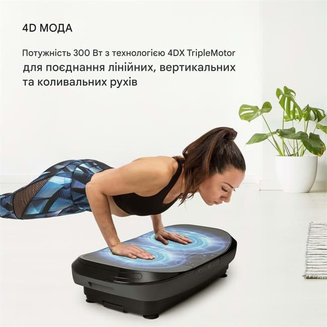 Революція руху: завдяки технології 4DX TripleMotor вібротренажер Klarfit VIBE 4DX Pro не тільки рухається лінійно та вертикально, але також коливається вгору та вниз, тобто в усіх трьох напрямках. Завдяки своїм трьом двигунам він також здатний поєднувати всі напрямки руху в комплексному тренувальному режимі та генерувати загалом 7 типів рухів! Це активує особливо глибокий обертальний рух - різницю, яку ви відчуєте з кожним волокном! У взаємодії трьох двигунів спортивний пристрій досягає амплітуди коливань 0-12 мм, вертикальної амплітуди 1-2 мм і лінійної амплітуди 0-8 мм, які мають частоти коливань 7,2-12,3 Гц, вертикальні частоти 25,2 -39,4 Гц і лінійні частоти 6,3-8,8 Гц адресують, стимулюють і тренують абсолютно нові групи м'язів до нового рівня продуктивності.