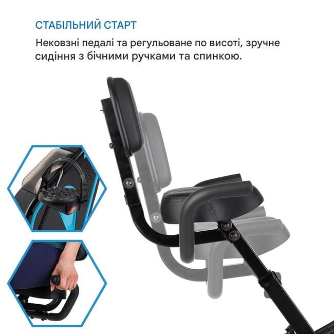 - Відмінна стійкість: нековзні педалі, зручне сідло з бічними ручками та спинкою, що регулюється по висоті