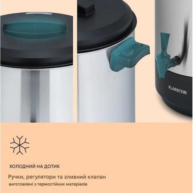 Завдяки вишуканому та гігієнічному інтер’єру з нержавіючої сталі, крану для зливу прохолодного на дотик і вбудованій функції підігріву він також ідеально підходить як диспенсер для гарячих напоїв для чаю, пуншу або глінтвейну.