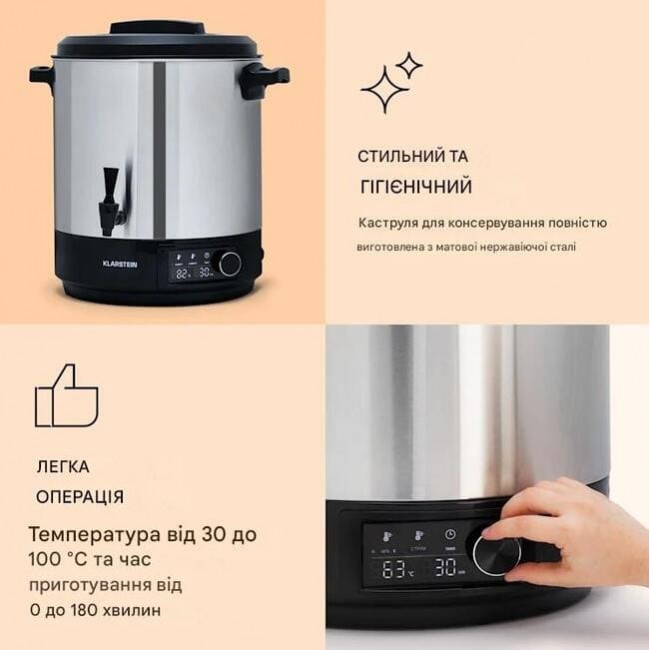 Сьогодні готуємо, консервуємо! Консервний горщик Klarstein Abbey 25 урізноманітнює меню - з довготривалим ефектом. Консерва об’ємом 25 л пропонує достатньо місця для використання тепла, щоб перетворити вміст ваших банок для консервування в консерви тривалого зберігання. Незалежно від того, чи це урожай фруктів чи овочів, приготування солодкого варення, ситна ковбасна суміш чи готовий гуляш, печеня та рулади – в Abbey 25 вони зберігаються завдяки температурі 30 – 100 °C і тривалості приготування до 180 хвилин.