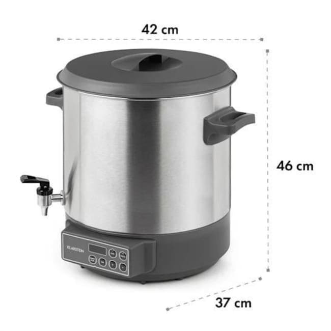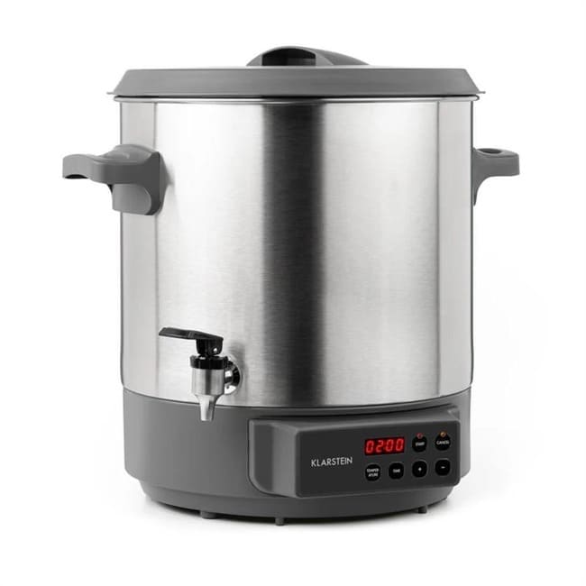 Klarstein Lady Marmalade Cooking Pot додає різноманітність у меню – з довгостроковим ефектом. Великий консервний горщик При корисній ємності 27 літрів достатньо місця, щоб перетворити вміст до 14 літрових банок для консервування у довгоживучі консерви з підігрівом. Будь то врожай фруктів чи овочів, таких як вишня, фасоль чи горох із міста, соління, солодке варення, ситна ковбасна маса чи готовий гуляш, печиво та рулети – вони зберігаються в Lady Marmalade. Операція дуже проста: помістіть наповнені склянки у кастрюлю, налийте воду, потім виберіть потрібну температуру кипіння від 30 до 100°C, встановіть годину кипіння від 5 хвилин до 12 годин, і все готове. Особливо корисним є вбудований цифровий дисплей, на якому можна прочитати всі налаштування. Кастрюля автоматично підтримує вибрану температуру і відключається по закінченні години кип'ятіння.