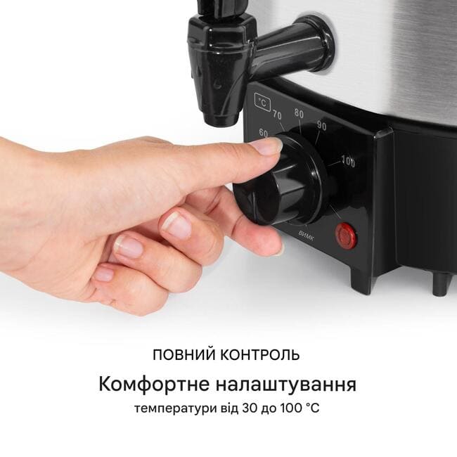 Але можливості Biggie Eco на цьому не закінчуються. Завдяки безпечному для смаку та гігієнічному матеріалу з нержавіючої сталі, крану та вбудованій функції підігріву, він також ідеально підходить як диспенсер для гарячих напоїв, таких як гарячий чай, суп або глінтвейн, що покращує вигляд вечірок, фуршетів або конференц-залів.