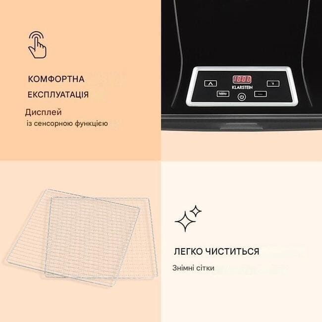 Температуру та час сушіння можна легко встановити на дисплеї. Просто розподіліть потрібну їжу на різних рівнях, накрийте кришкою, і ви готові до роботи.