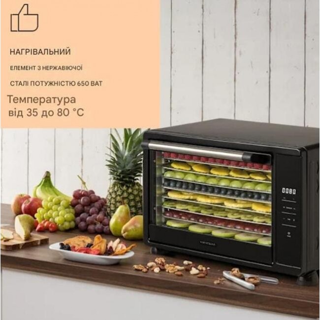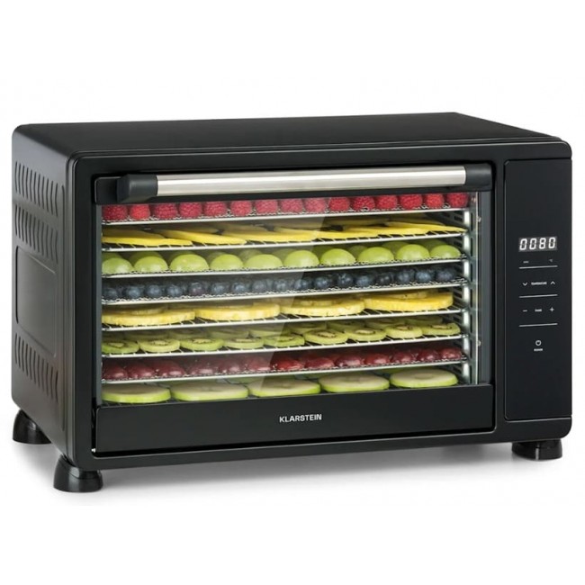 Потужний дегідратор Klarstein Mega Jerky сушить фрукти, овочі, м’ясо та інші продукти з рекордною швидкістю, створюючи смачні закуски та інгредієнти, які довго зберігаються. Mega Jerky має правильну температуру для всього. Його нагрівальний елемент із нержавіючої сталі потужністю 650 Вт забезпечує температуру від 35 до 80 °C. Завдяки внутрішньому конвектору з системою циркуляції гарячого повітря тепло рівномірно розподіляється між 8 рівнями сушіння. Є програмований таймер для правильного часу висихання.