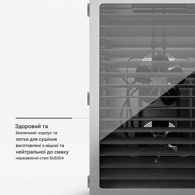 Корпус дегідратора з нержавіючої сталі підвищує його довговічність та спрощує догляд. Гладка поверхня легко протирається, а лотки, що знімаються, можна мити в посудомийній машині, що економить час і зусилля на кухні.