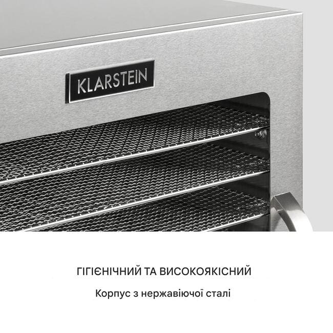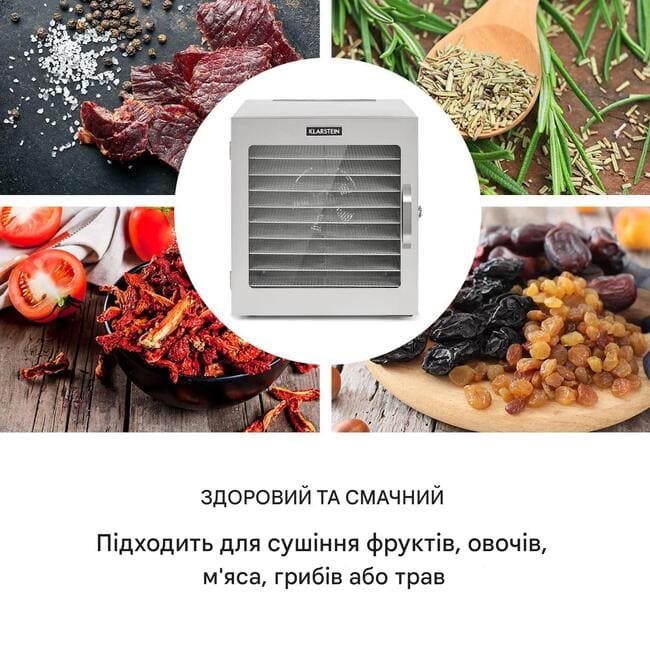 Дегідратор Captain Jerky 110 від Klarstein має площу понад 1,1 м² для різноманітних продуктів і 10 полиць із стійкою до іржі нержавіючої сталі, що підходить для сушіння різноманітних делікатесів.
