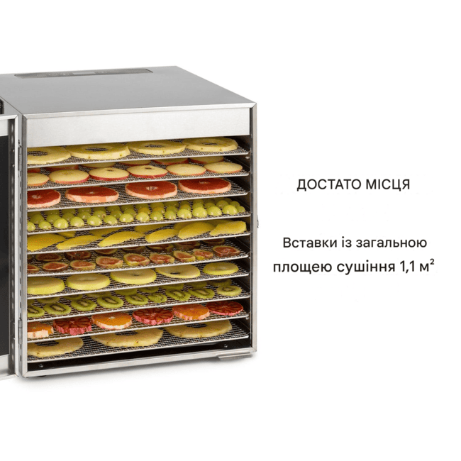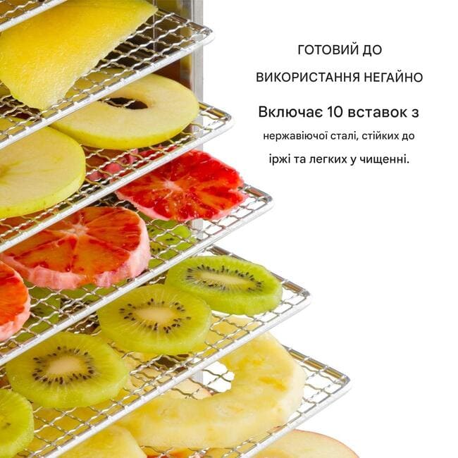 Очищення дегідратора після завершення процесу сушіння абсолютно не складне: вставки з нержавіючої сталі можна легко помити в посудомийній машині. Пристрій із матовим корпусом із нержавіючої сталі є перлиною кожної кухні, а його великі скляні дверцята з ручкою з нержавіючої сталі дозволяють у будь-який час побачити його внутрішні роботи.