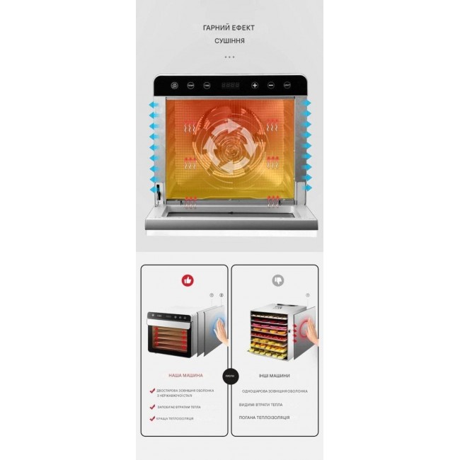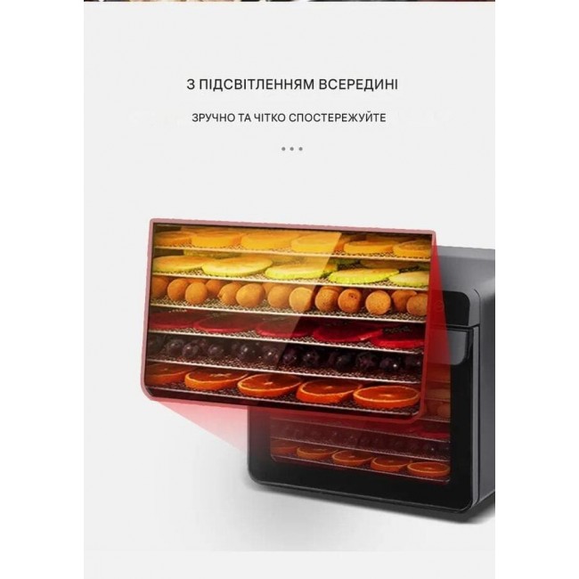 Автоматизована робота дегідратора оптимізує процес сушіння, мінімізуючи необхідність ручного втручання та заощаджуючи ваш час. Зручний інтерфейс полегшує керування, а міцна конструкція гарантує тривалий термін служби та надійність.