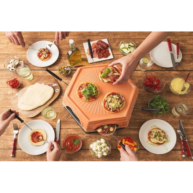 Приготувати смачну піцу ще ніколи не було так просто: просто поставте духовку на стіл, розігрійте її й потім додайте свої власні творіння на сервер піци. Тепер просто засуньте підіймач у духовку , зачекайте 5-7 хвилин, дістаньте — готово! Коли справа доходить до покриття, немає меж уяві. Capricciosa печі для піци пропонує деко з діаметром 35 см для приготування їжі, на якій можна розмістити на 6 піці серверів із діаметром 11 см. Звичайно, на таці можна також приготувати велику піцу, хоч яку б ви вибрали.