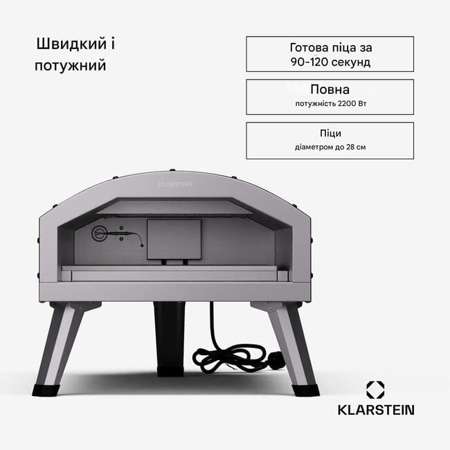 Завдяки вражаючій потужності 2200 Вт та здатності досягати температури до 450°C, піч для піци Klarstein LaFiamma готує вашу піцу за рекордні 90-120 секунд. Насолоджуватися улюбленою піцою миттєво ще ніколи не було так просто!