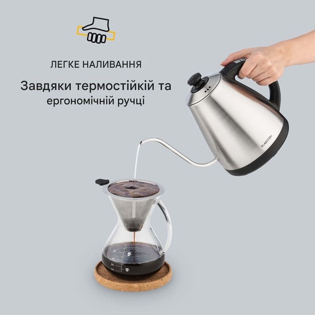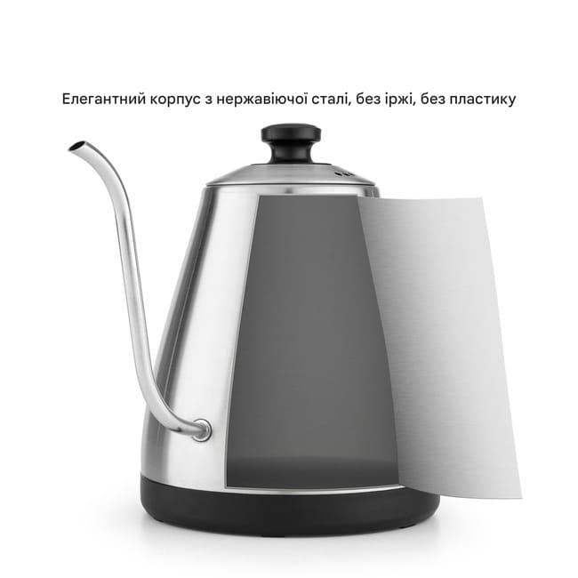 - Стильне кип'ятіння води: точний контроль наливання завдяки носику з гусячою шиєю