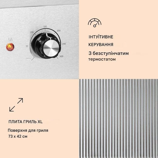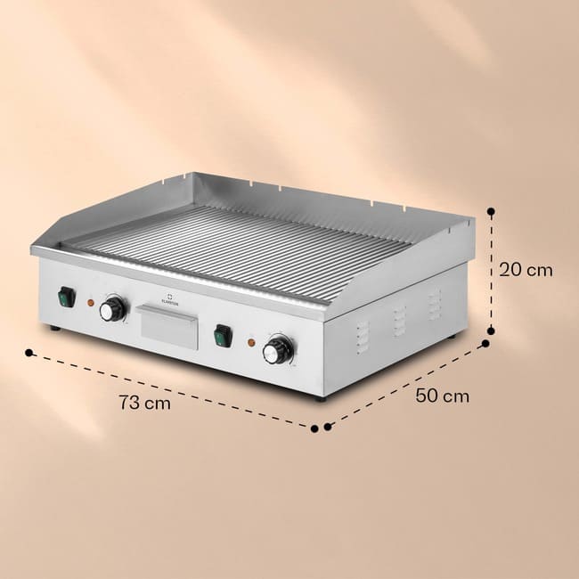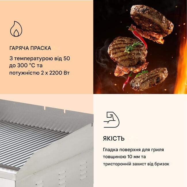 З потужністю 2 × 2200 Вт та діапазоном температур від 50 до 300 °C, він забезпечує безперервне приготування стейків, ковбасок та інших страв на гриль-поверхні розміром 73 × 42 см. Тристоронній захист від бризок підвищує безпеку та спрощує процес перевертання їжі. Надлишковий жир стікає у знімний жирозбірник, який легко очистити після приготування. Корпус із нержавіючої сталі забезпечує зручне та швидке чищення.
