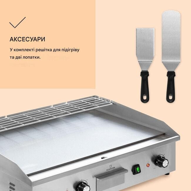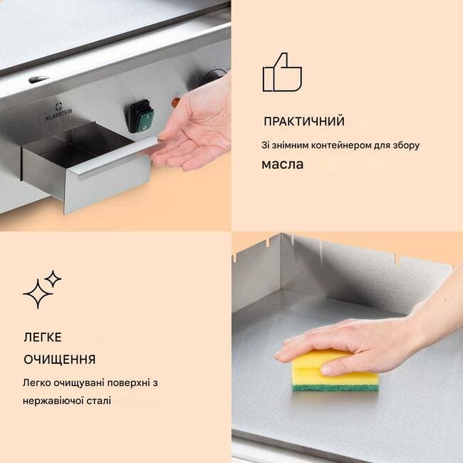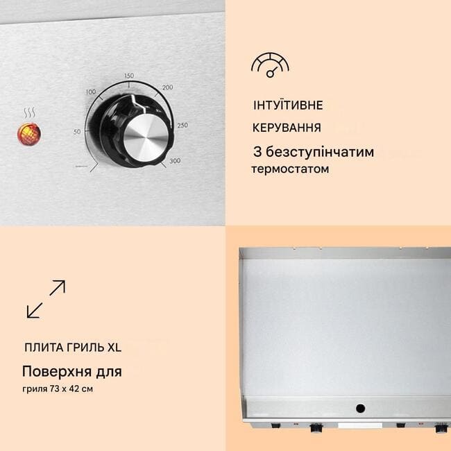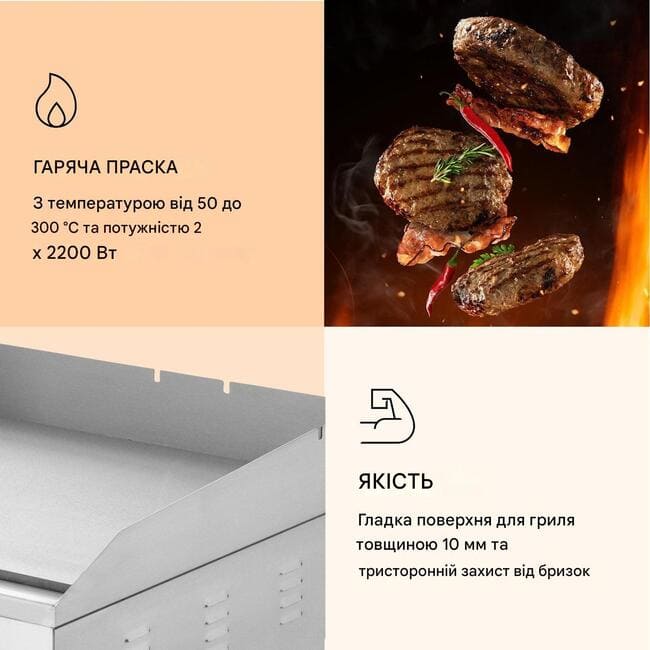 Завдяки потужності 2 x 2200 Вт і температурному діапазону від 50 до 300 °C він безперервно обсмажує та готує стейки, сосиски або цілі страви, смажені на сковороді, на пластині гриля розміром 73 x 42 см. Тристоронній захист від бризок може забезпечити безпеку і практичний опір при повороті. Надлишок олії стікає в знімний піддон для збору крапель, і його можна легко утилізувати в кінці приготування барбекю. Подальше очищення також особливо легко завдяки корпусу з нержавіючої сталі.