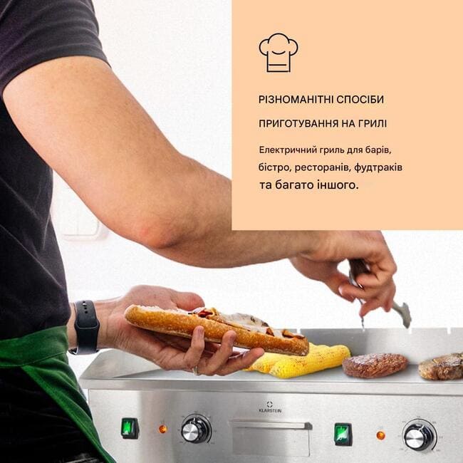 Електричний гриль Klarstein Grillmeile 4400 дозволяє готувати смачні фірмові страви прямо з гриля - підходить для обладнання фуд-траків, снек-барів або торгових кіосків у сфері громадського харчування.