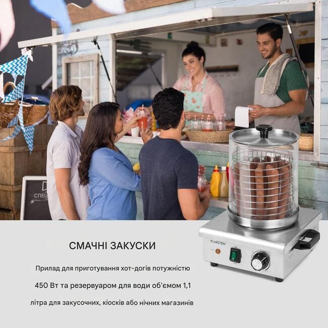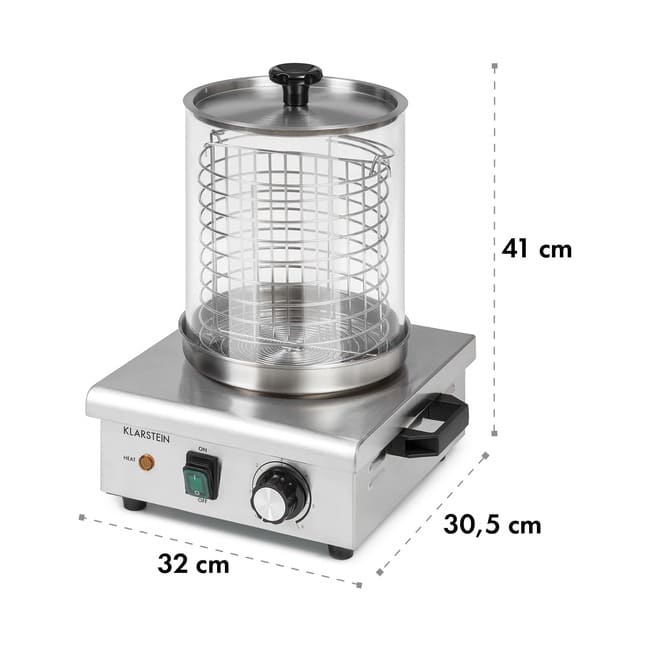 Апарат для приготування хот-догів Klarstein Wurstfabrik 450 призначений для швидкого та стабільного приготування гарячих закусок у закусочних, торгових кіосках, кафе та магазинах із нічною торгівлею. Пристрій забезпечує рівномірний нагрів сосисок і підтримання оптимальної температури протягом усього робочого дня.
