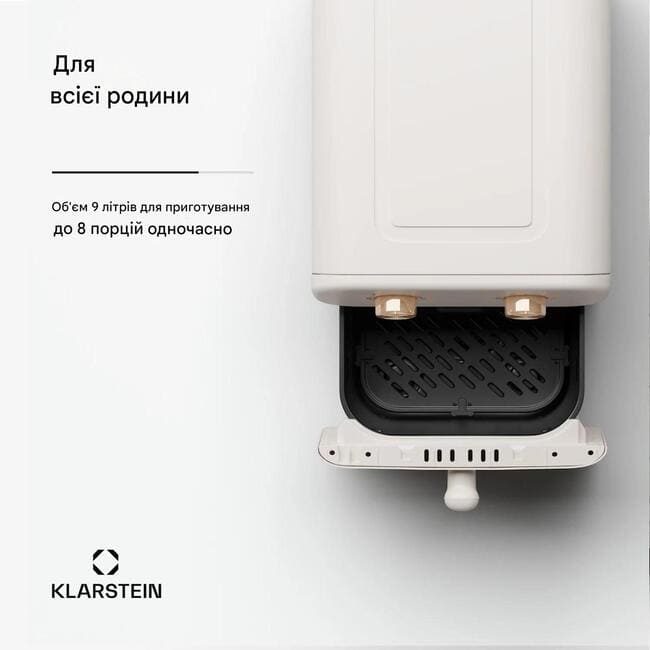 Гриль, смаження, запікання: з фритюрницею з гарячим повітрям Klarstein AeroCrisp 9 приготування їжі з низьким вмістом жиру відбувається швидко та легко. Аерофритюрниця смажить і запікає з потужною потужністю 1900 Вт завдяки циркуляції гарячого повітря. Тепло розподіляється швидко та оптимально за допомогою високошвидкісної конвекційної технології та готує їжу м’яко та швидко з усіх боків; розморожування не потрібне. AeroCrisp створено для простого та мінімалістичного дизайну: температуру та час можна регулювати двома кнопками. Решта компактна і проста, але все ще пропонує 9 літрів простору всередині - достатньо для 8 порцій картоплі фрі одночасно. Це означає, що пристрій підходить для будь-якої кухні та не займає більше місця, ніж це необхідно.