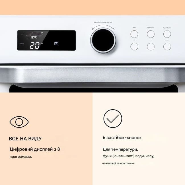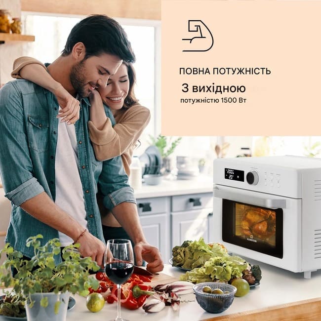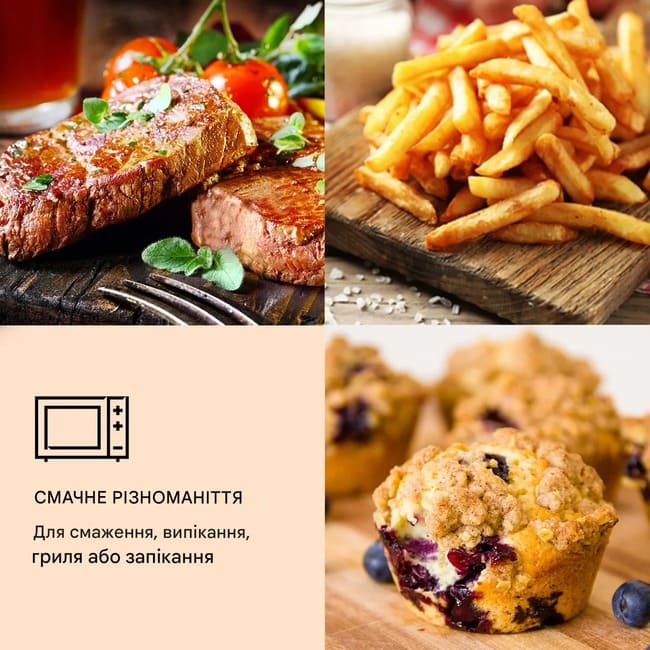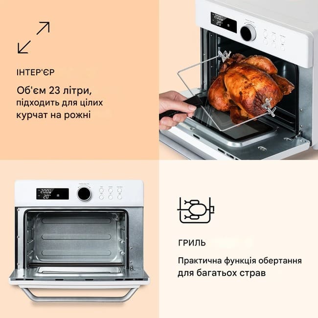 - 8 програм: смаження гарячим повітрям, смаження гарячим повітрям і рожнів, верхнє нагрівання, нижнє нагрівання, верхнє і нижнє нагрівання, ферментація, розморожування, підтримка тепла.
