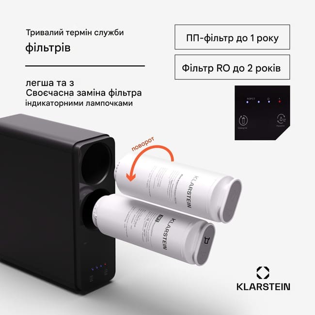 Щоб забезпечити беззважену відсутність у вашій щоденній воді зважених частинок, мікробів та присмаків, фільтр для води Klarstein PureLine використовує два фільтри в п'ятиступеневій системі очищення. Він видаляє понад 1000 забруднювачів, таких як свинець, хлориди, фториди, важкі метали, вапняний наліт, присмаки та запахи, забезпечуючи раніше небачений рівень чистоти води. Завдяки коефіцієнту фільтрації 2:1 від нефільтрованої до фільтрованої води, система має порівняно невеликі втрати води та очищає до 800 GPD (3000 літрів) води на день. Це еквівалентно приблизно двом літрам фільтрованої води за хвилину. Система також має чудові показники над та під раковиною. Завдяки безрезервуарній конструкції вона займає на 70% менше місця, ніж звичайні фільтри зворотного осмосу , і поміщається майже в будь-яку шафку під раковиною. Інтелектуальні системи попередження вчасно попередять вас, коли потрібно замінити два фільтри. Але не хвилюйтеся: залежно від забруднення вихідної води та використання системи, фільтр PPC служить до одного року, а фільтр RO - до двох років. Змішувач, що входить до комплекту, легко встановлюється на раковину лише за допомогою одного отвору.