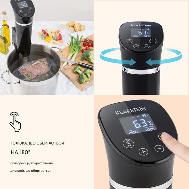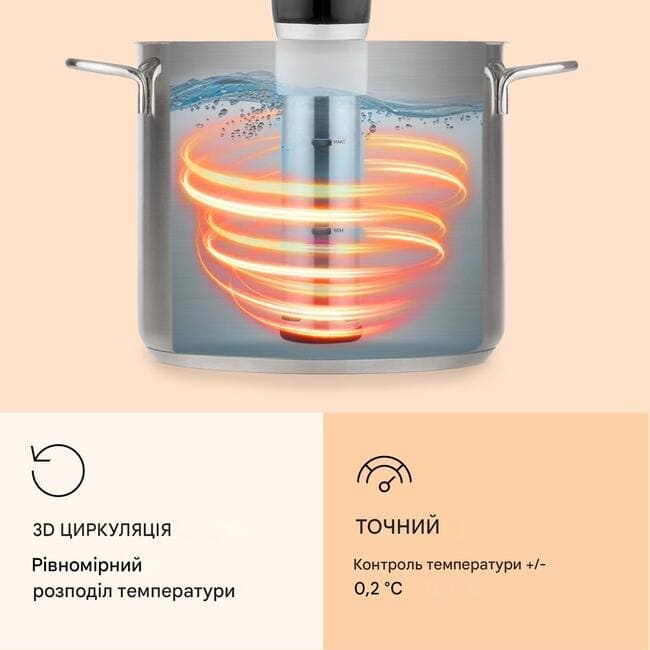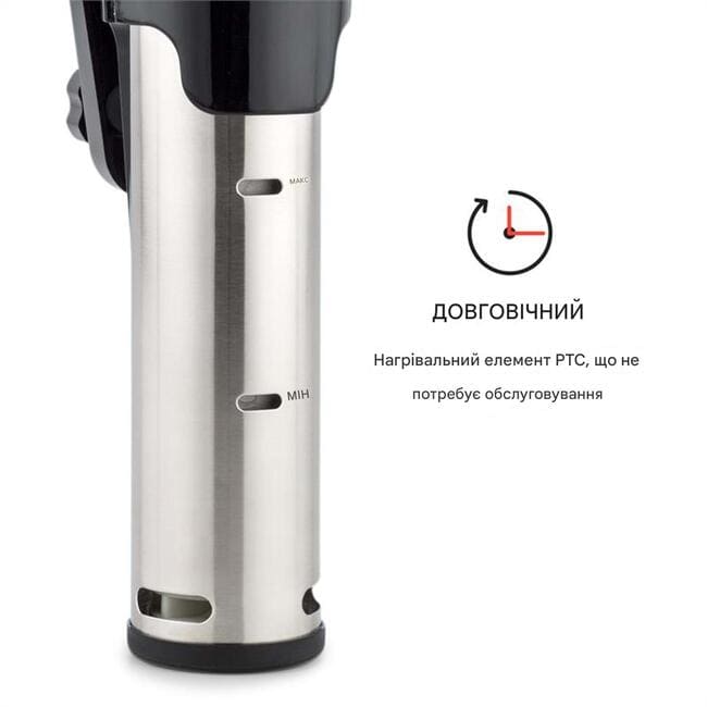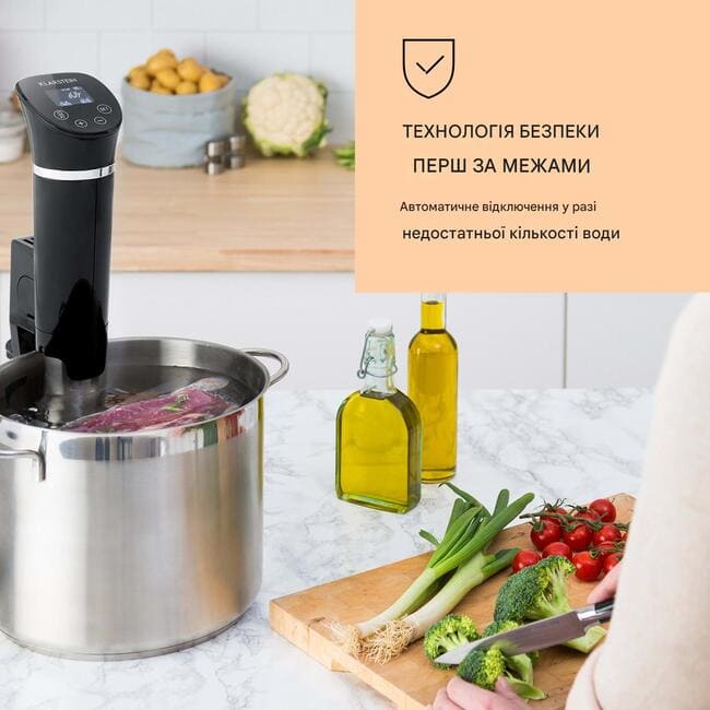 Безпека під час приготування гарантована будь-коли: палочка sous vide водонепроникна за IPX7 і може бути легко та надійно прикріплена до краю пристрою на краю каструлі. Завдяки технологии Safety First пристрій вимикається у разі браку води.