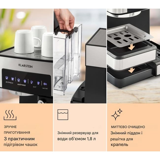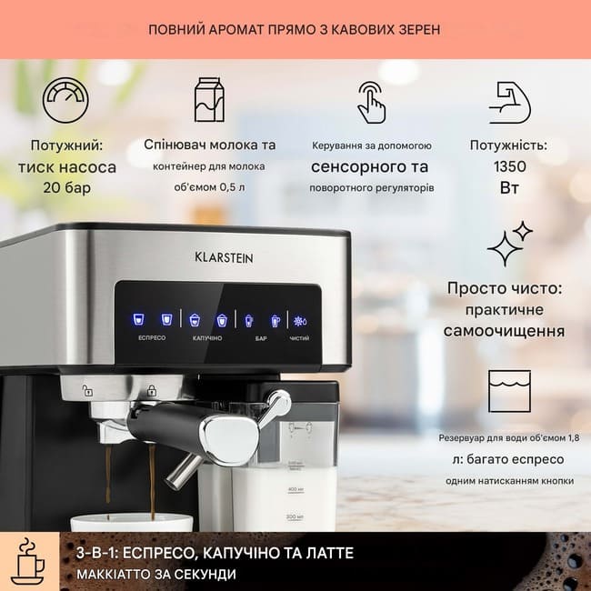 Кавомашина KLARSTEIN Arabica Comfort 1350W 20 бар 1.8л сенсорна панель управління