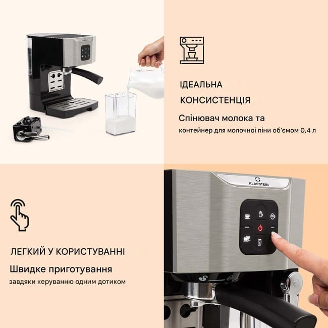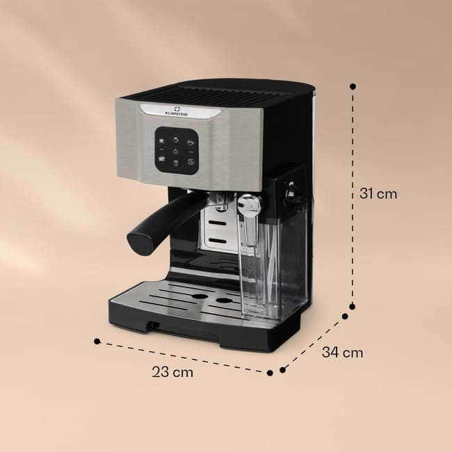 Завдяки легкому приготуванню та управлінню одним дотиком, ароматна насолода та ідеальний смак гарантовані. Завдяки потужній потужності 1450 Вт і тиску 20 бар, Klarstein BellaVita продавлює гарячу воду через мелені кавові зерна і таким чином розвиває їх повний аромат. За бажанням можна зварити еспресо, капучіно або латте макіато.