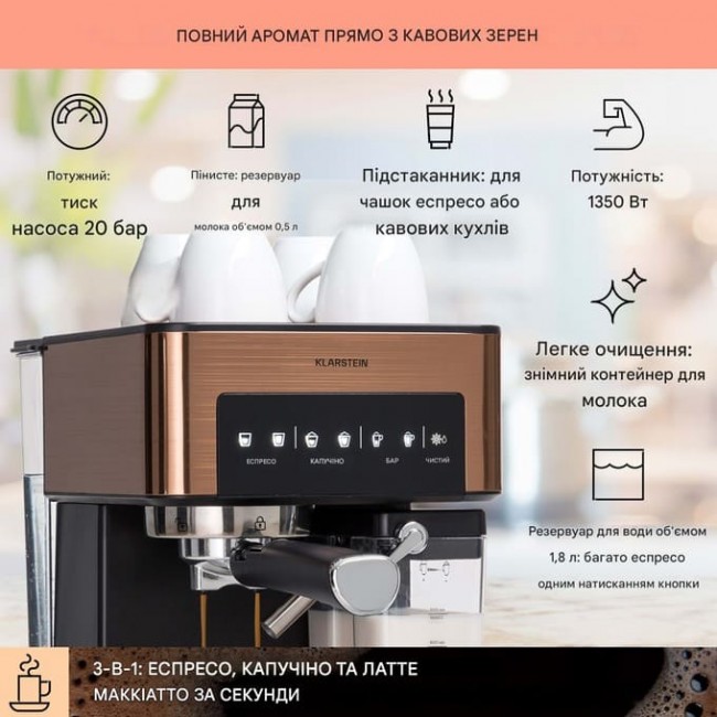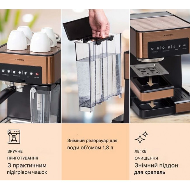 Для пристрасних любителів кави: дозвольте кавоварці Klarstein Arabica Comfort переконати вас смачним еспресо, капучіно та латте макіато одним натисканням кнопки. Завдяки насадці для спінювання з нержавіючої сталі 90° і знімному резервуару для молока ви можете будь-коли індивідуально регулювати виробництво молочної піни. Ви також можете варити мелену каву або за допомогою практичного кавового блоку. Завдяки знімному резервуару для води об’ємом 1,8 л і піддону для крапель, який можна мити, рівномірне очищення надзвичайно просте.