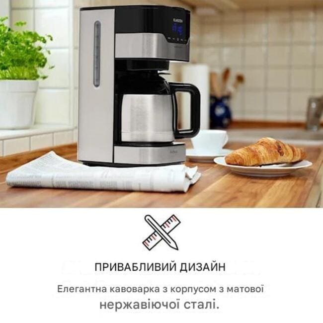 Управління кавомашиною просте та зрозуміле завдяки зручному для читання РК-дисплею та інтерфейсу керування EasyTouch. Після того, як кава буде поміщена в постійний фільтр і вода в резервуарі, міцність кави можна вибрати з кількох рівнів на дисплеї. Резервуар для води вміщує до 1,2 літра, цього достатньо для 12 чашок кави. За допомогою 24-годинного таймера ви можете за бажанням встановити час початку приготування свіжої кави з точністю до хвилини: хто не хоче, щоб його прокидав вранці запах свіжої кави? Оскільки він потрапляє безпосередньо в термос, він дуже довго залишається гарячим.